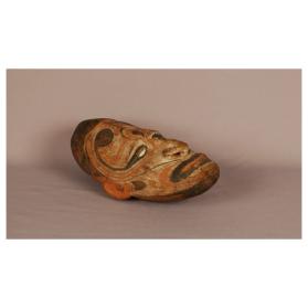 Painted, carved mask with small boar's head on chin and cowry shell eyes
