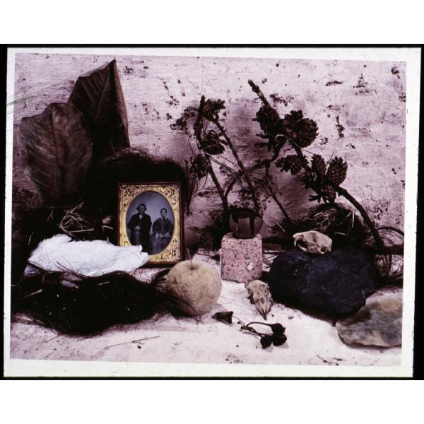 DescriptionA still life photograph of an assemblage composed of dried leaves and flowers, feathers, hair, rocks, an apple and a framed photograph. still life, assemblage, figurative, portrait, figures, male, female, vegetation, leaves, flowers, rocks, food, fruit, apple, biological material, hair, feathers vanitas