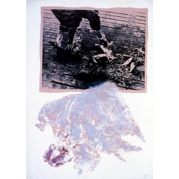 Descriptionfigurative, figure, clothing, boots, animals, squid, floor, wood, dock, hand print, smudge, impression