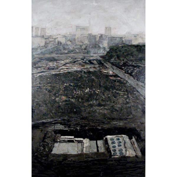 DescriptionAn urban landscape depicting groups of industrial buildings surrounded by a thick fog and black hills. landscape, urban, industrial, architecture, buildings, fog, smoke, soil, hills Berlin