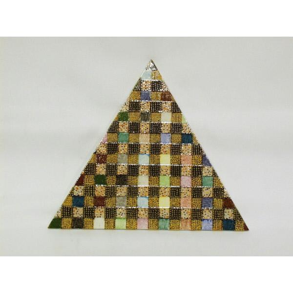 DescriptionAn abstract sculpture composed of a triangle patterned with a grid of squares in various colours. abstract, shapes, triangle, squares, grid, repetition, pattern geometric abstraction