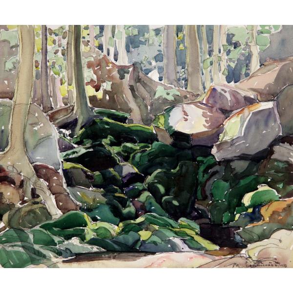 DescriptionA landscape depicting a forest with a floor of moss-covered rocks. Sunlight shines in through the trees at the upper right corner of the composition. landscape, forest, rocks, vegetation, trees, sun, light