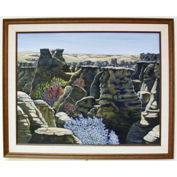 DescriptionA landscape depicting trees and eroded rock formations, with hills in the background. landscape, vegetation, trees, plants, rocks, hoodoos, erosion, hills, sky Writing-On-Stone National Park
