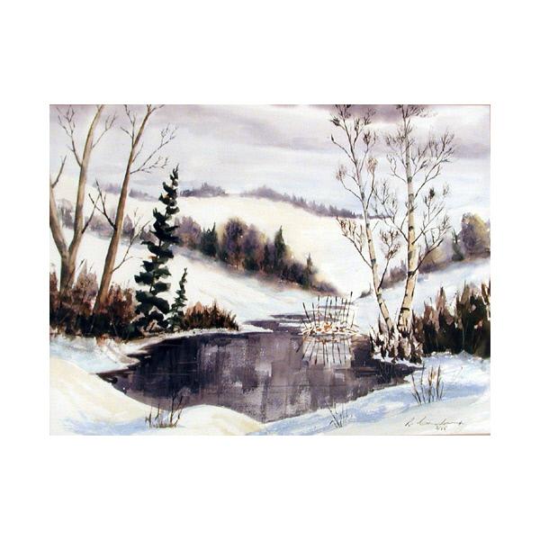 DescriptionA landscape depicting a body of water surrounded by snowy hills and trees under a cloudy sky. landscape, water, lake, snow, hills, vegetation, grass, bushes, trees, sky, clouds