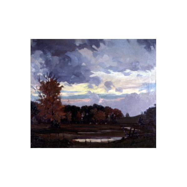DescriptionA landscape depicting a shallow body of water bordered by a fence and trees, under a cloudy sky. landscape, water, hills, vegetation, grass, bushes, trees, fence, sky, clouds October, Connestoga, Ontario
