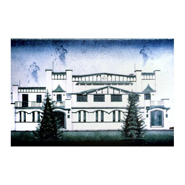DescriptionA figurative painting depicting a multi-level building with two trees on its front lawn. Three couples dancing are faintly visible in the sky above the building.   figurative, figures, male, female, dance, clothing, suit, dress, embrace, hug, architecture, building, vegetation, trees, grass, lawn, sky