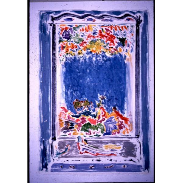 DescriptionA figurative print depicting a window with flowers hanging from the top of the frame and sitting on the sill. figurative, window, frame, vegetation, flowers