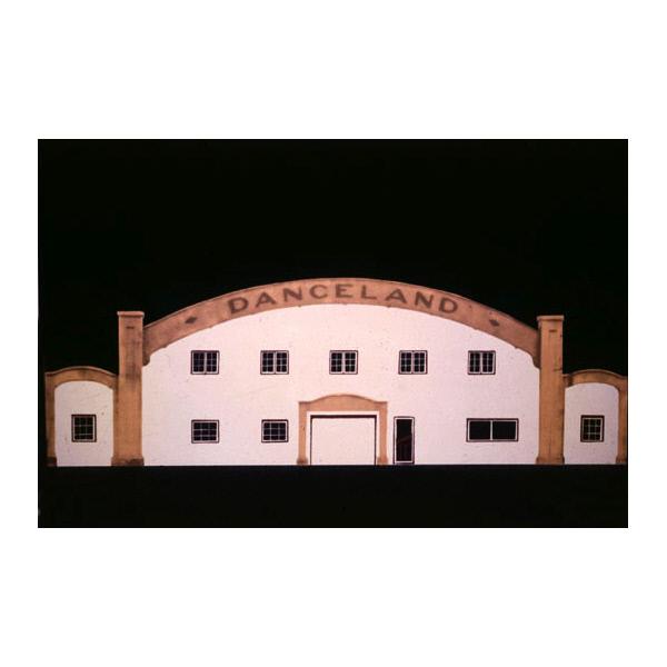 DescriptionA figurative print depicting a building with an arched roof and columns against a black background.   figurative, architecture, building, columns, arch, windows, doors, sign, text
