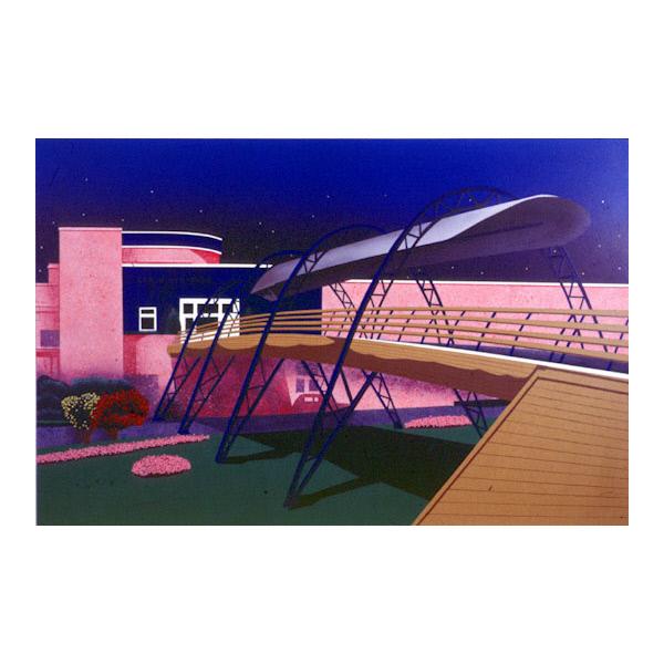 DescriptionA figurative painting depicting a building with an elevated walkway covered with an arched roof.   figurative, architecture, building, bridge, walkway, roof, arch, vegetation, grass, lawn, bushes, sky