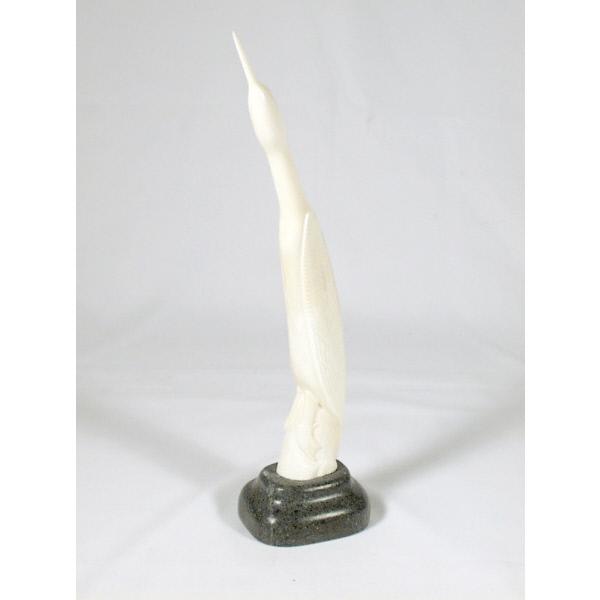 DescriptionA figurative sculpture of a stylized loon with its beak pointing upwards, set on a stone base. figurative, animal, bird, loon, base