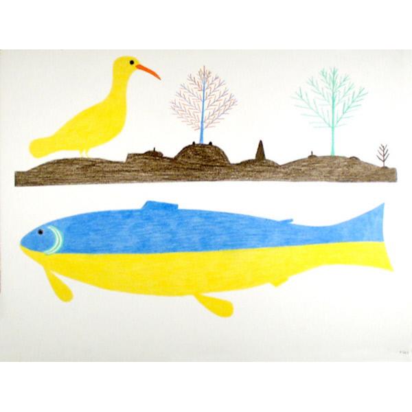 DescriptionA figurative drawing depicting a large fish underneath a bird sitting on an expanse of land with trees and plants. figurative, animals, bird, fish, landscape, hills, vegetation, plants, trees