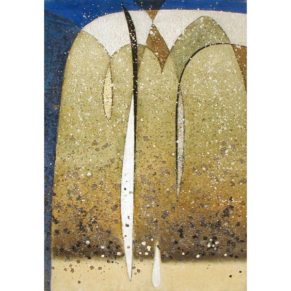 DescriptionAn abstract painting composed of layers of translucent arches over a blue background, patterned with repeating dots of neutral colours. abstract, shapes, arches, translucent, dots, pattern, repetition