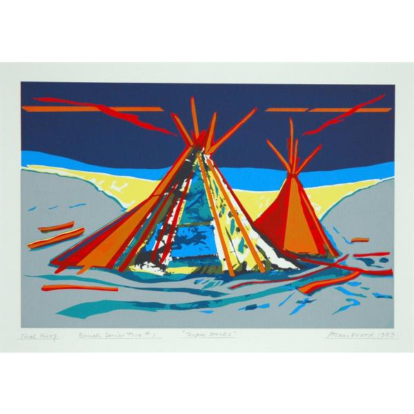 DescriptionA landscape depicting two teepees with a range of hills in the background. There are linear shapes in the sky that are echoed in the supports of the teepees and the pieces of wood on the ground. landscape, shelters, teepees, horizon, sky