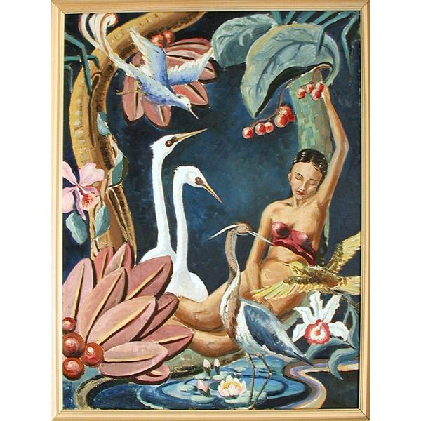 DescriptionAn exotic landscape depicting a nude woman leaning against a tree surrounded by various animals and plant life. figurative, figure, female, nude, landscape, vegetation, tree, plants, flowers, animals, birds