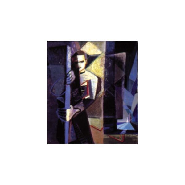DescriptionA figurative painting depicting a man gripping the edge of a door, casting a shadow across half of his face and body. The space around him is abstracted with geometric planes and shapes in various dark colours. figurative, figure, male, door, abstract, shapes, geometric self-portrait