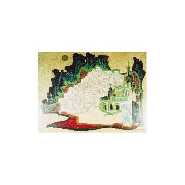 DescriptionA landscape depicting stylized buildings and a hill against a yellow sky. landscape, architecture, buildings, hill, sky, sun, moon, stylization