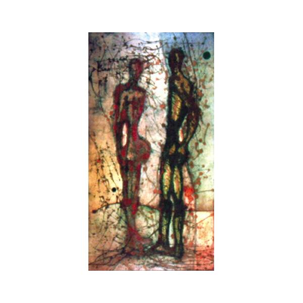 DescriptionA figurative painting depicting two stylized figures in an abstracted space of sections of colour and splashes of paint. figurative, abstract, figures, stylization, splashes, drips