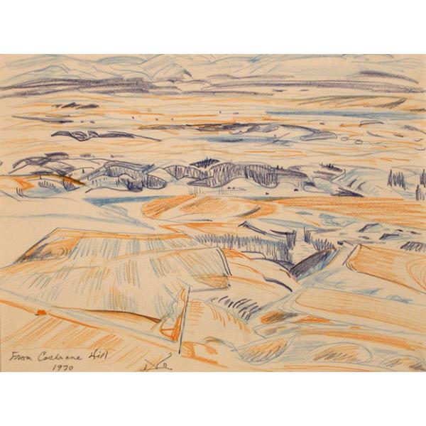 DescriptionA landscape depicting an aerial view of hills and a mountain range in the background. landscape, aerial, hills, mountains Cochrane Hill