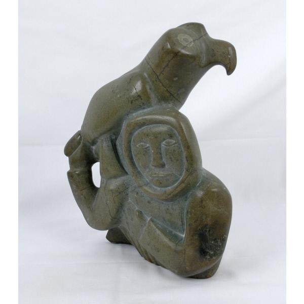 DescriptionA figurative sculpture of a hooded figure with a bird on its shoulder. figurative, figure, clothing, jacket, hood, animal, bird