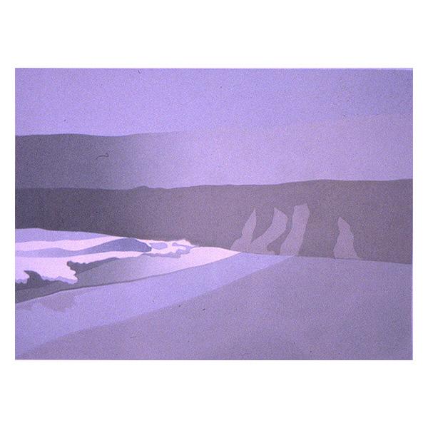 DescriptionA stylized landscape depicting waves rolling onto a beach bordered by hills. landscape, hills, soil, sand, shore, beach, water, waves, shadow, sky, stylization