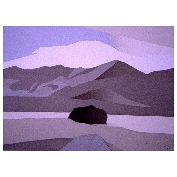 DescriptionA stylized landscape depicting rocks on a flat expanse of land in front of a range of mountains. landscape, rocks, hills, mountains, sky, clouds, stylization