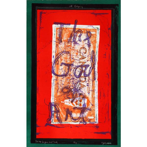 DescriptionA figurative print replicating Canadian money, with the image of a bearded man replacing that of the Queen. Text written over the image reads "The God of Art". figurative, figure, male, money, text, type, handwriting, border self-portrait