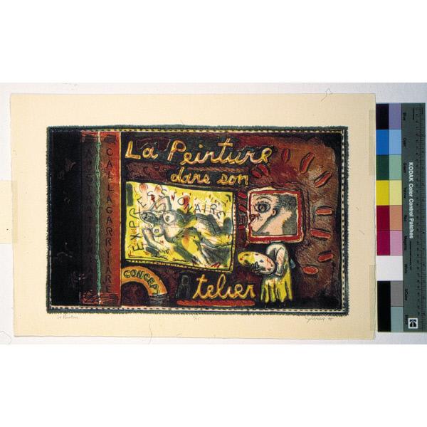 DescriptionA figurative print depicting a man with an abstracted head holding an artist's palette and paintbrush, standing beside a painting of an abstracted nude woman. Text running along the upper and lower edges of the composition reads "La Peinture dans son Atelier" which translates into English as "The Painter in the Studio". figurative, figures, male, female, nude, artist, painting, tools, brush, palette, text, handwriting