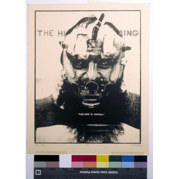 DescriptionA figurative print depicting a bearded man wearing a face mask, with text written below his chin reading "The Hide Is Coming!". figurative, figure, male, beard, clothing, mask, text self-portrait