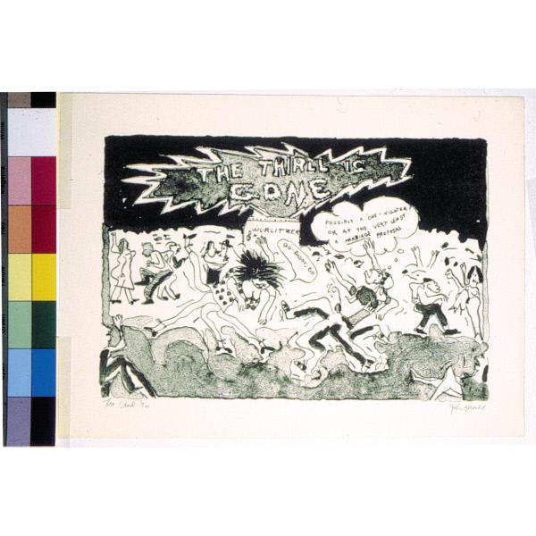 DescriptionA figurative print depicting a group of men and women dancing around a box with a treble clef and the word "Wurlitzer" written on it. figurative, figures, male, female, speech, text