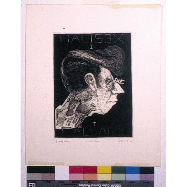 DescriptionA figurative print depicting the face of a man in profile, with his musculature and arterial systems visible. Text is written above and below his image. figurative, figure, male, profile, anatomy, text