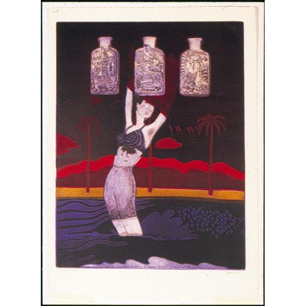 DescriptionA figurative print depicting a woman dressed in underwear and standing in front of a stylized landscape. Three bottles line the upper edge of the composition. figurative, figure, female, clothing, underwear, vessels, bottles, landscape, water, shore, vegetation, trees, mountains, hills, stylization