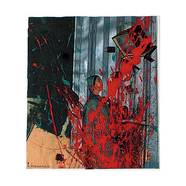 DescriptionAn abstract collage consisting of layers of paper depicting figurative imagery and abstract patterns, obscured by splashes of red paint. abstract, collage, layers, figurative, figure, interior, television, abstract, repetition, pattern, splash