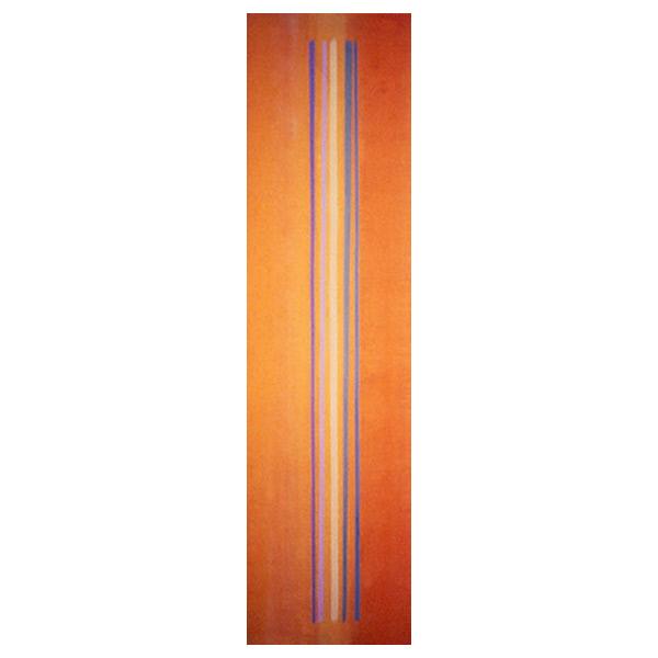 DescriptionAn abstract painting composed of five vertical lines of blue, purple and yellow placed in the centre of the canvas against a red background. abstract, linear, vertical