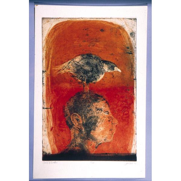 DescriptionA figurative print depicting the face of a figure in profile with a bird standing on the top of the figure's head. figurative, figure, head, animal, bird