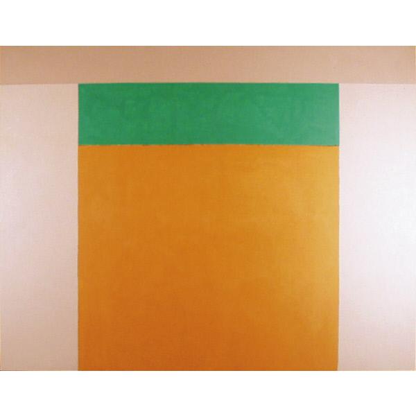DescriptionAn abstract painting composed of a square divided in two sections and bordered by pink rectangles. abstract, shapes, square, rectangles, horizontal, vertical, sections