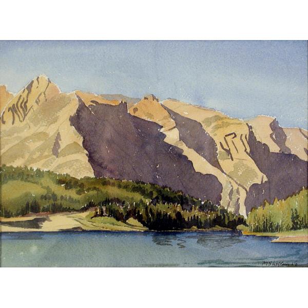 DescriptionA landscape painting depicting a body of water lined by forested hills and a rocky mountain range. landscape, water, lake, hills, vegetation, trees, forest, mountains, sky Minnewanka, Mt. Aylmer
