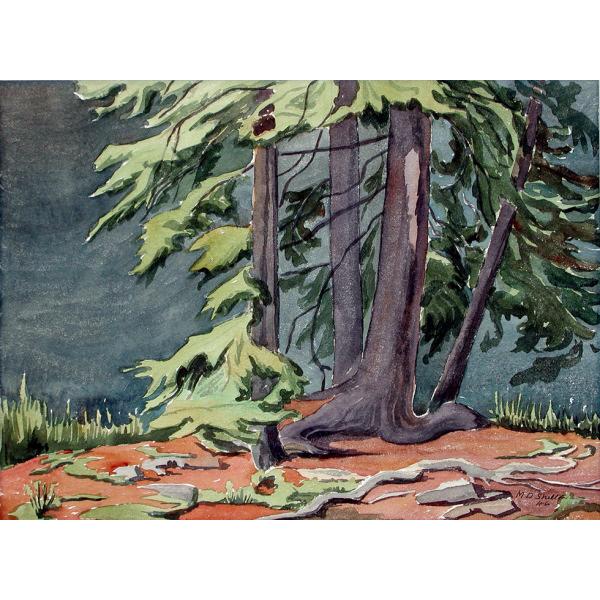 DescriptionA landscape painting depicting a group of trees against a dark sky. landscape, vegetation, trees, grass, wood, soil, rocks, sky Jasper, Alberta