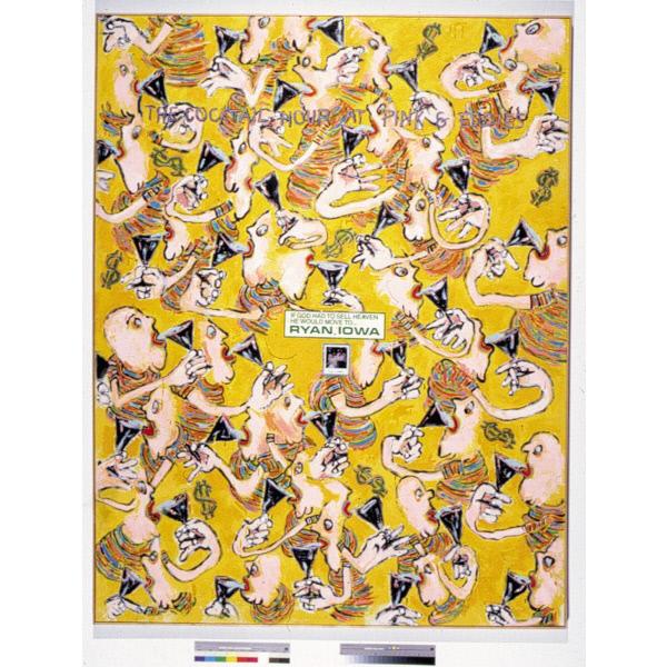 DescriptionA figurative painting depicting numerous female figures with oversized heads drinking from wine glasses. Text is present among the figures and on a bumper sticker placed in the centre of the canvas that reads "If God had to sell heaven, he would move to... Ryan, Iowa". figurative, figures, female, vessels, glasses, drink, repetition, pattern, text Ryan, Iowa