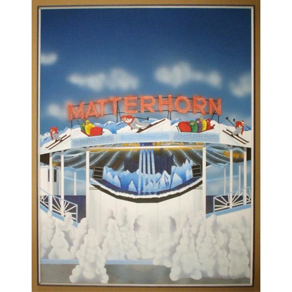 DescriptionA figurative painting depicting an amusement park ride with a sign reading "Matterhorn" against a cloudy sky.   figurative, amusement park, carnival, fair, ride, sign, text, sky, clouds