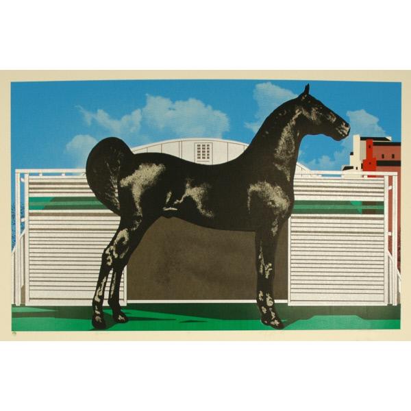 DescriptionA figurative print depicting a horse standing in profile against a fence, with buildings visible in the background on the right side of the composition.   figurative, animal, horse, architecture, agriculture, fence, buildings, farm, vegetation, grass, sky, clouds