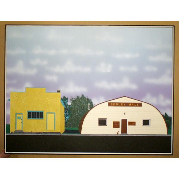 DescriptionA landscape painting depicting two buildings along a paved road, with trees and a cloudy sky in the background.   landscape, architecture, buildings, signs, text, road, street, sidewalk, vegetation, trees, sky, clouds