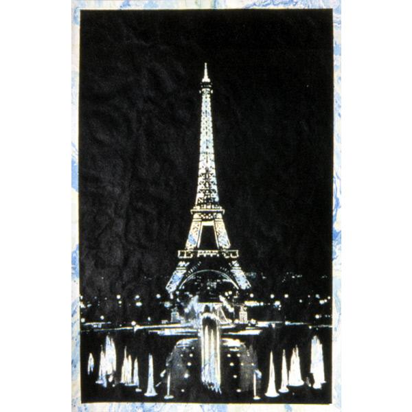 DescriptionA figurative print depicting a tower lit at night, with a pool and multiple fountains in the foreground of the composition.   figurative, architecture, monument, tower, lights, night, water, pool, fountains   Paris