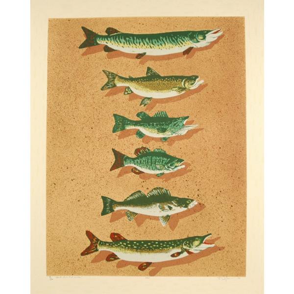 DescriptionA figurative print depicting a row of fish of various sizes against a brown background.   figurative, animals, fish, row