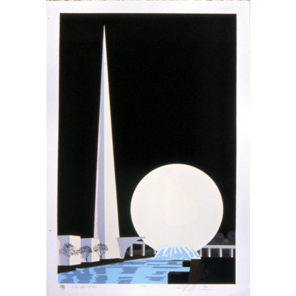 DescriptionA figurative print depicting buildings and trees lining a pool with a fountain flowing from a sphere.   figurative, architecture, buildings, railing, tower, spire, vegetation, trees, water, pool, fountain, shape, sphere  World's Fair