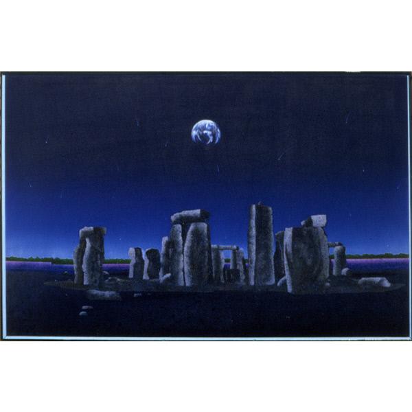 DescriptionA landscape depicting a ring of sculptures constructed from rocks in shadow, with a horizon line in the background and the moon and shooting stars in the sky.  landscape, rocks, sculptures, ring, formation, horizon, shadow, night, sky, moon, stars