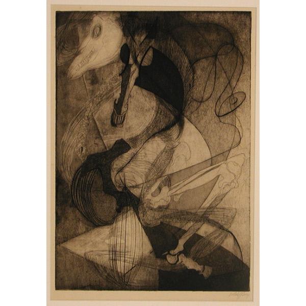 DescriptionAn abstract print composed of overlapping shapes and linear elements surrounding two animal heads and a skeletal leg. abstract, figure, skeleton, leg, bones, animals, heads, shapes, lines