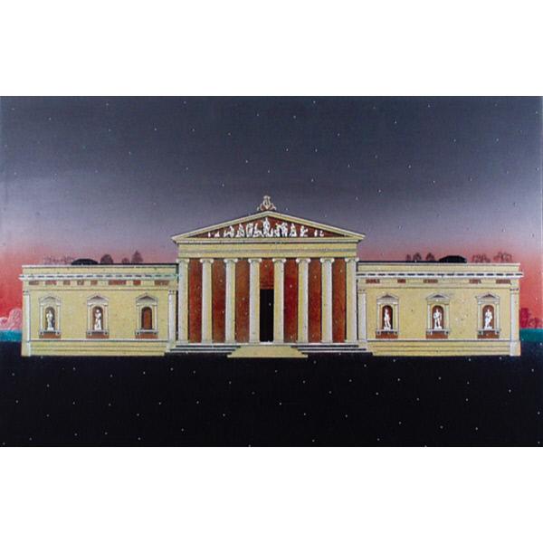 DescriptionA figurative painting depicting a building with columns and classical sculptures of figures in enclaves along its front.   figurative, architecture, building, columns, enclaves, sculptures, figures