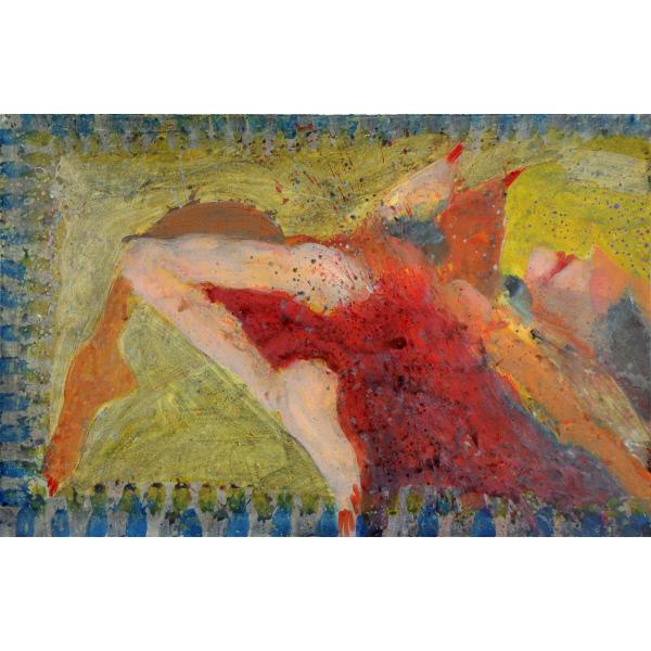 DescriptionA figurative painting depicting an abstracted nude woman reclining against a brown background bordered by repeating brush strokes. figurative, abstract, figure, female, nude, border, brush strokes, repetition, pattern