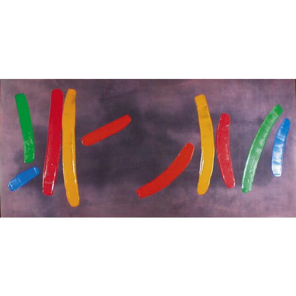 DescriptionAn abstract painting composed of brightly coloured, slightly curved lines against a purple background. abstract, lines, vertical, diagonal, curve