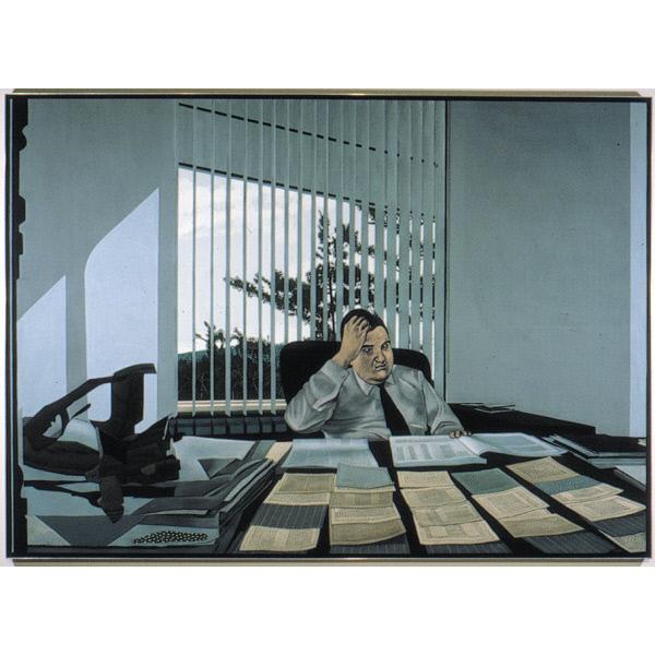 DescriptionA figurative painting depicting a man wearing a shirt and tie, seated at a desk that has piles of paper on it. The window behind his chair has open blinds and shows the branches of a tree outside. figurative, figure, male, clothing, shirt, tie, interior, room, office, furniture, desk, chair, papers, documents, window, blinds, vegetation, tree